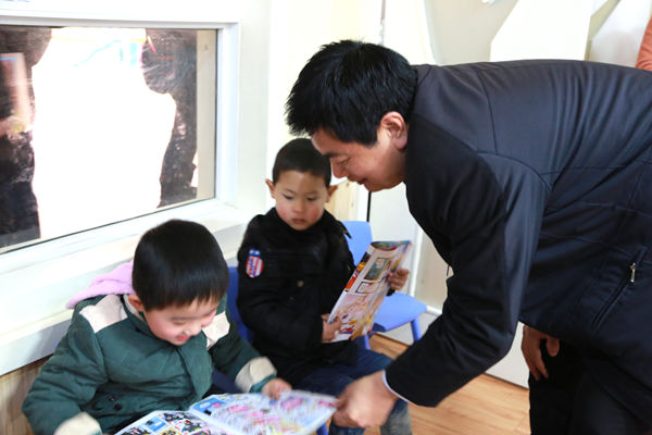 與會(huì)人員參觀新落成的德外幼兒園時(shí),理事長與小朋友在一起
