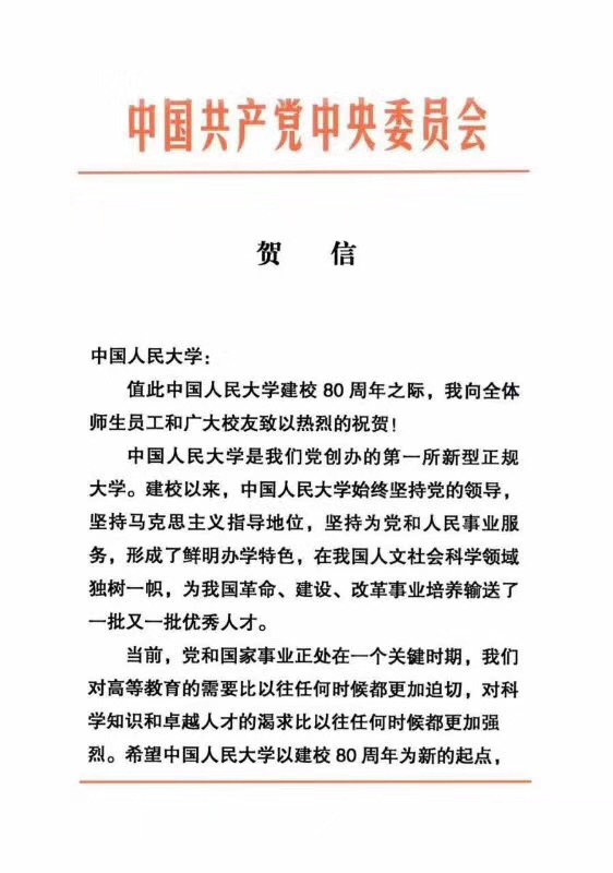 習(xí)近平總書(shū)記向中國(guó)人民大學(xué)建校80周年發(fā)來(lái)賀信